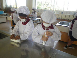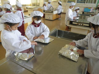 1・2年生が、ふれあいまつりに向けて、やきいもの準備をしました。自分達で、苗を植え、掘って洗ったさつまいもです。今年は、大きいさつまいもが多く、アルミホイルを巻くのも一苦労です。おいしい焼き芋になりますようにと思いをこめて巻きました。