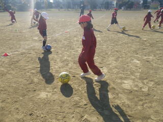 埼玉県サッカー協会の講師の皆様にお越しいただき、ボールとなかよくなるための遊びや二人組でゲームを行いました。講師の方からこつを学ぶと、子供達は、ボールからぴったり離れないようにドリブルをすることができようになりました。