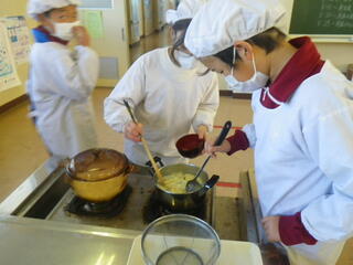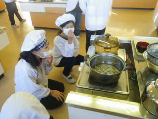 5年生が、耐熱ガラスの鍋を使って、羽生市の特別栽培米の炊飯をしました。鍋の中の米の様子を見ながら、火加減を調節しました。そして、同時にだしからみそ汁をつくりました。子供達は手際よく調理を行い、ご飯とみそ汁をおいしくいただきました。