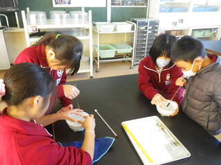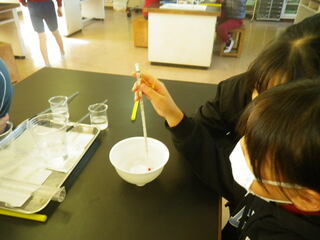 5年生が、理科の学習で物が水にとけるときの重さや限度について調べるため実験をしました。ミョウバンは、温度を上げるとたくさん溶けることがわかりました。食塩は、温度を上げても溶ける量は変わらないことに気付きました。