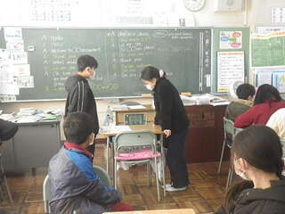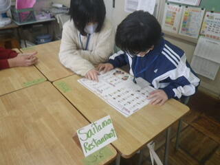 外国語の学習では、レストランに行って、お客として食事を注文したり、お店の人になって注文を聞き取って値段を伝えたりする活動を行いました。注文を聞き取って値段を言うために、メモしながら聞いている姿が見られました。