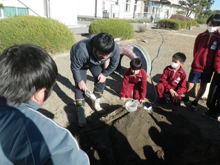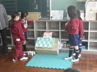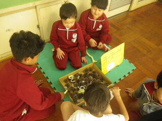 秋から準備をしていた1・2年生合同のおまつりを行 いました。まつぼっくりやどんぐりを使ったつりや宝探し、こま回しなど1年生が遊びを考えました。招待された2年生は、1年生がルールを説明するのをよく聞いて、仲良く遊ぶことができました。