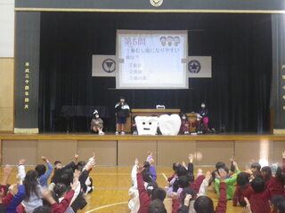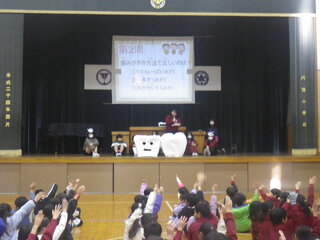 給食・保健委員会の児童が歯みがきレンジャーに変身し、全校児童に歯みがきの仕方を紹介しました。クイズ形式で、歯ブラシの使い方や歯こうがついたままだと健康に悪いことなどを学びました。