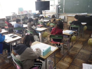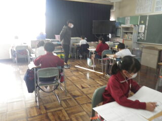 今まで学習したことが身に付いているかどうか自分の力を試すため、算数と国語の問題に挑戦しました。よく問題を読んで考えなくてはならない難しい問題にも、最後まであきらめず粘り強く取り組んでいました。