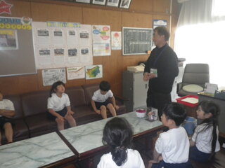 一年生が生活科で学校探検をしています。今日の3時間目、はじめて校長室を訪れました。「これはね、お客さんが使うソファーです。すわっていいですよ。」「やったー!」「ふかふかー!」