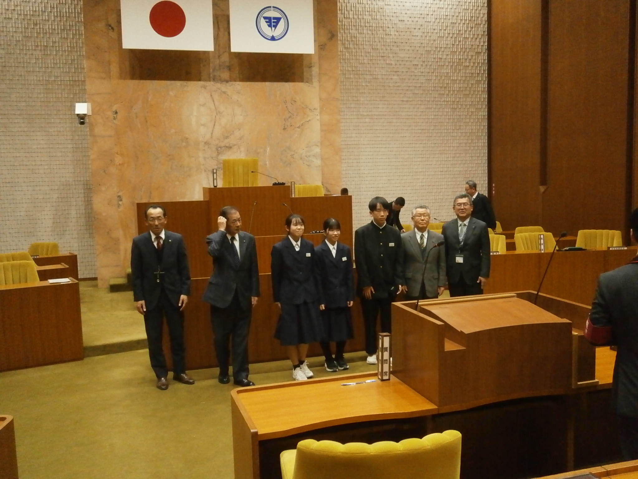 本日午後、羽生市役所議場で「令和7年度 羽生市中学生議会」が開催されました。本校からは3名の生徒が参加し、「羽生市内小中学校の体育館の空調設備について」、「羽生市の道路整備について」、「羽生市の外国籍の生徒の増加について」の質問をそれぞれ行い、市執行部から御答弁をいただきました。