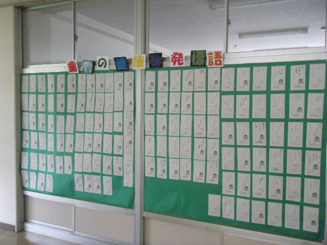 本校でも、健康委員を中心に、「正しいブラッシング」など、歯磨きの重要性を呼びかけたり、「歯と口の健康標語」の作成をしたりしていきます。(写真の標語は、昨年度のもの。本年度の標語は、でき次第掲載します)