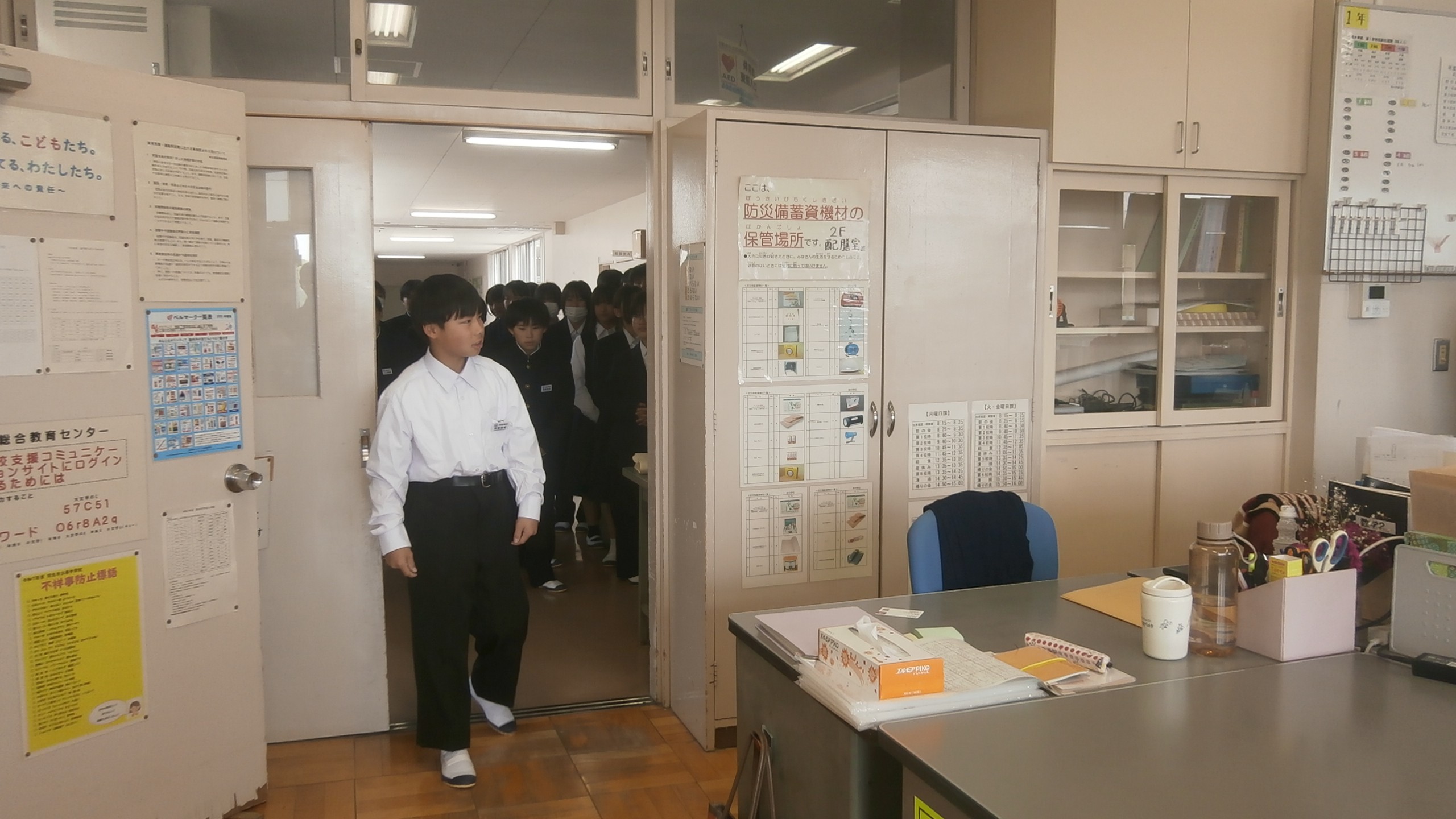 1年生 職員室の入り方を教わっています。