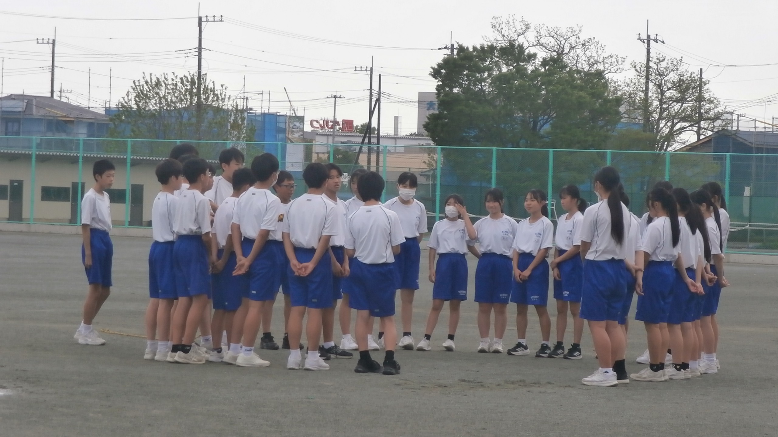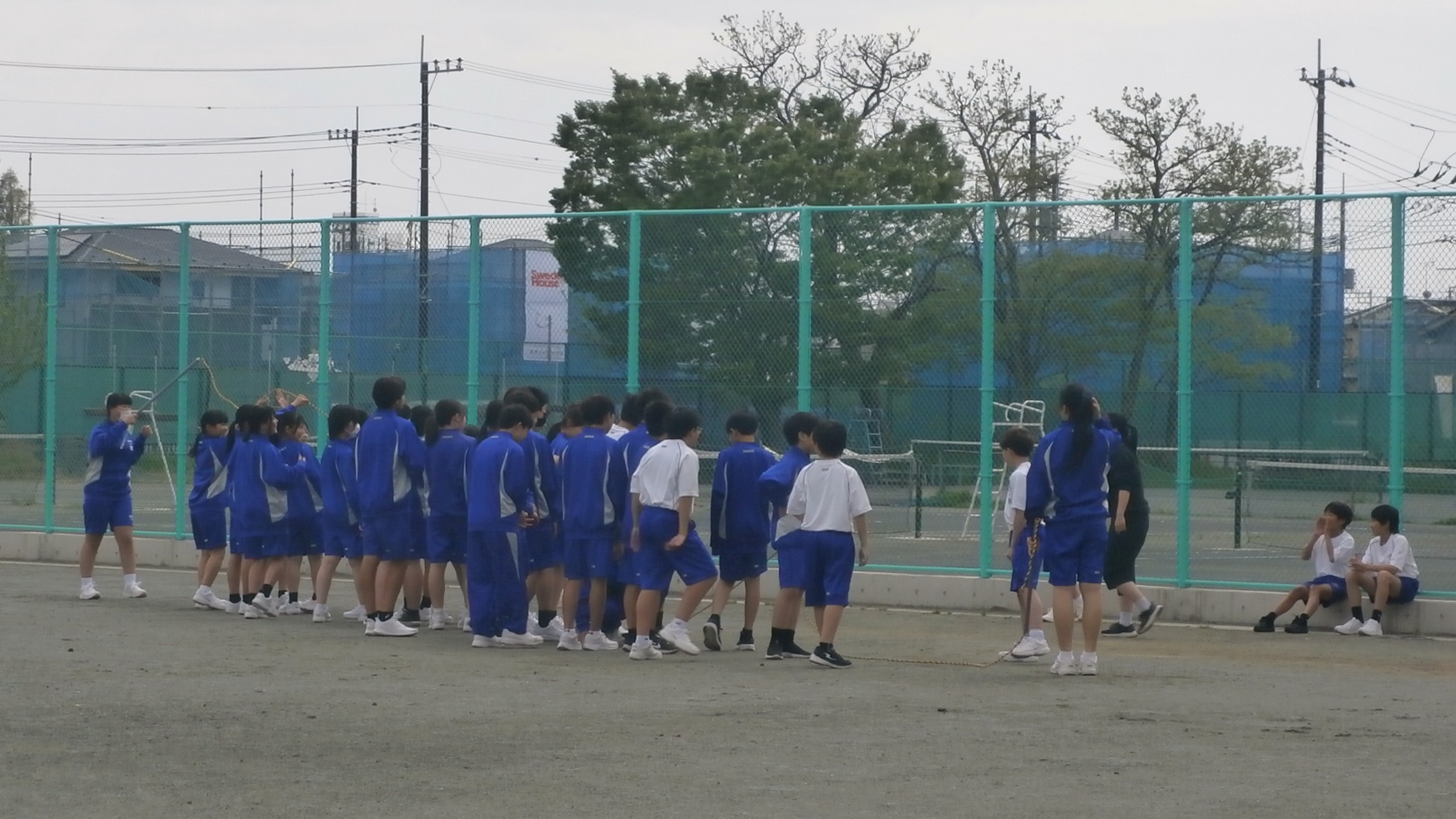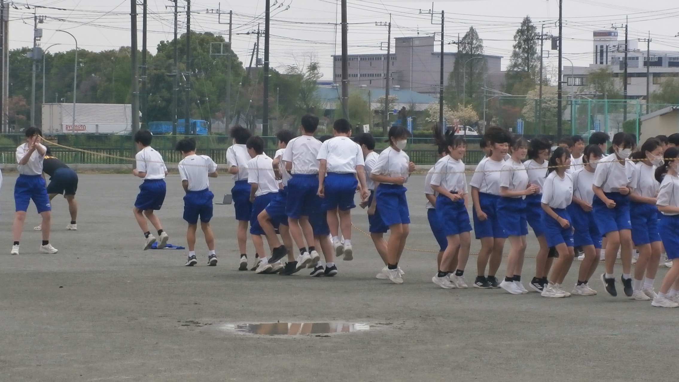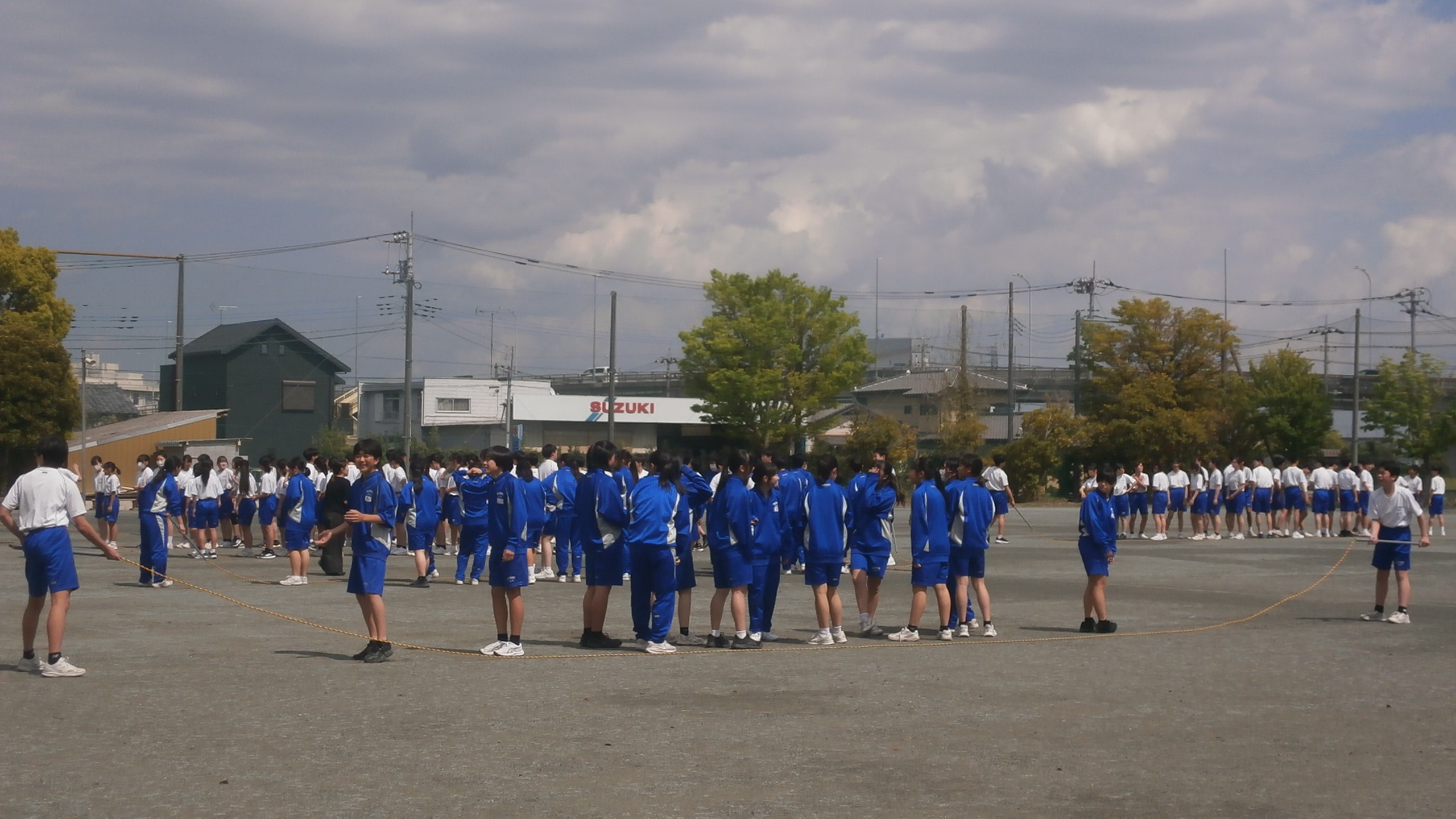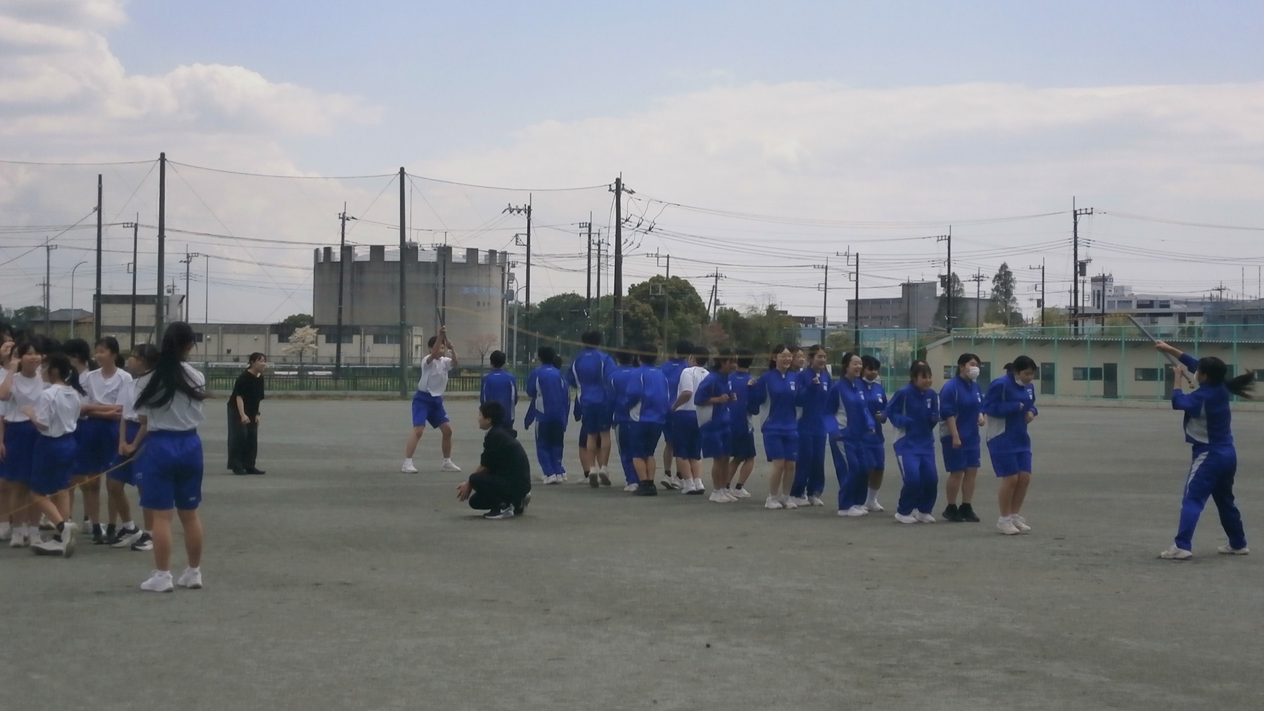 公開日 2026年04月16日 本日も昼休みの長縄練習が盛り上がっていました。昨日の雨で、水たまりもある中で、生徒たちは乾いた場所を見つけて、頑張っていました。1年生も一クラスが始まりました! 終了後の反省会の様子も本当に素敵です!