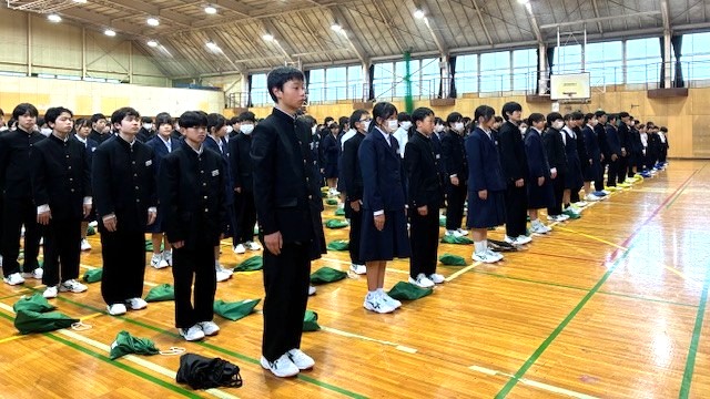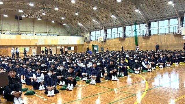 本日、全校朝会を行いました。あいにくの雨模様で登校が大変だったと思いますが、定刻前に整列し、整然と始まりを待つ姿や、話に耳を傾ける姿が立派でした。今週は明後日29日からゴールデンウィーク期間に入りますが、くれぐれも健康と安全に気をつけて過ごしてもらいたいと思います。