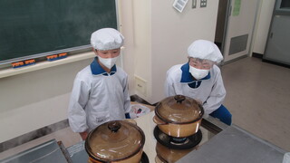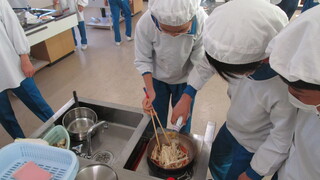 6年生が家庭科の時間に野菜のベーコン巻きをつくりました。手際よく野菜を切ったり、ベーコン巻きを炒めたりしました。ベーコンに巻ききれなかった野菜を炒めたり、白米を炊いたりもしました。とてもおいしそうでした。