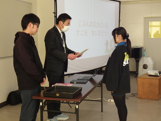 校長先生から「節分」についてお話がありました。自分の中にいる「オニ」を追い出して、明日から頑張りましょう!また、自主勉強70冊を達成した児童の表彰も行いました。継続は力なりです!