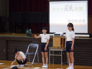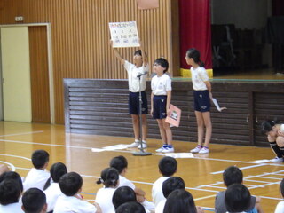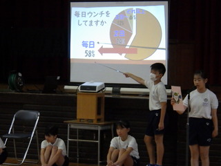 公開日 2025年06月24日 更新日 2025年06月24日 今朝の活動は「児童集会」です。健康委員会の児童が「おなか元気教室」と題して、排便の大切さやうんちで健康状態がわかることなどを発表してくれました。