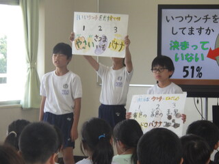 3年生、保護者の方々を対象とした学校保健委員会を開催しました。今回は「おなか元気教室」として、健康委員会児童の発表、養護教諭からの報告、加須ヤクルト販売の講師の方よりお話をいただきました。子どもたちには「早寝、早起き、朝ごはん、朝うんち」を守って、自分の健康を維持して欲しいです。