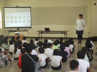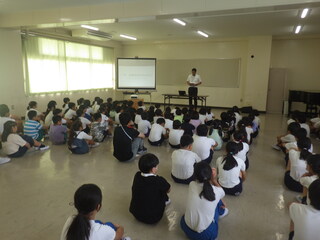 朝の暑さが厳しくなってきましたので、冷房のあるマルチルームで朝会を行いました。校長先生から目標にむかって努力することの大切さをお話しいただきました。また、生活目標についても担当の先生からお話がありました。