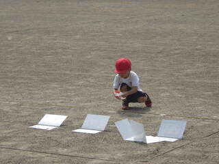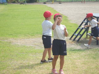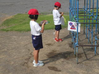 1年生が生活科の学習で水遊びを行いました。手作りの水鉄砲で的あてをしたり、シャボン玉をつくって遊んだりしました。