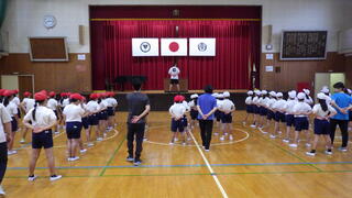 今朝の活動は全校での運動会練習です。並び方、気を付け・休めの姿勢、回れ右の動きなどを確認しました。