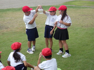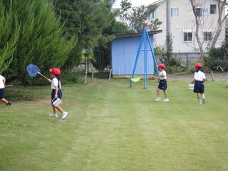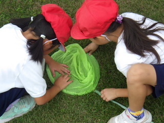 1年生が生活科の学習で虫取りを行いました。校庭にいる蝶やテントウムシなどを捕まえました。捕まえた後は、どんな虫がいたのかを発表しました。