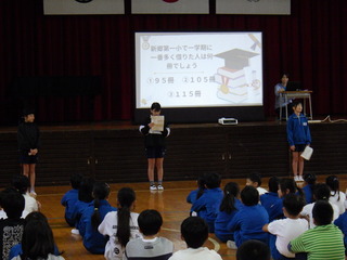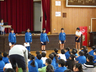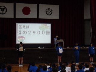 図書委員会による児童集会を行いました。図書に関するクイズを出したり、図書委員のおすすめの本を紹介したりしてくれました。