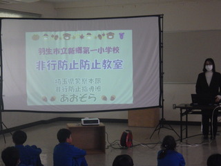 埼玉県警「あおぞら」の方々をお招きし、非行防止教室を行いました。「やってよいこと、悪いこと」「飲酒や喫煙が及ぼす影響」についてお話していただきました。子どもたちは真剣に話を聞いていました。