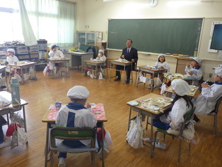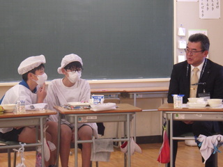 市長、教育長が来校し、子どもたちの学びの様子を見ていただきました。また、市長は1年生と、教育長は6年生と給食を一緒に食べました。子どもたちはたくさんのお話ができてうれしい様子でした。