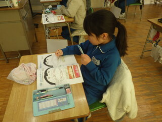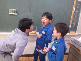 朝の時間にカラーテストを行いました。みがき残しがないかを自分で確認し、正しい歯の磨き方を身につけています。