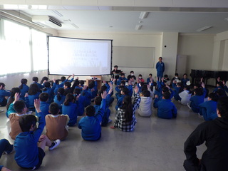公開日 2026年01月27日 更新日 2026年01月27日 マルチルームで児童集会を行いました。今日の担当は環境委員会です。環境委員会の仕事内容や本校で飼育しているウサギに関するクイズを出してくれました。