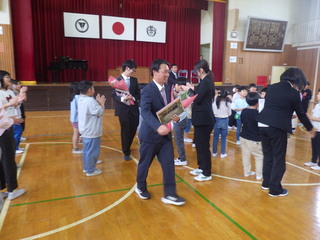 5時間目に離任式を行いました。異動された3名の先生と会った子どもたちは、久々に会えた喜びと、どこか寂しそうな表情が入り混じっていました。感謝のお手紙を渡したり、お花をプレゼントしたりもしました。3人の先生方。ありがとうございました。