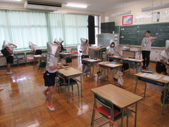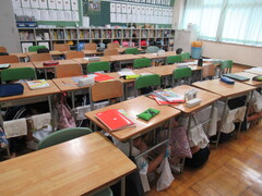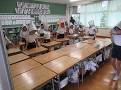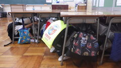 今回は教室にいるときの避難訓練を行いました。窓から離れること、机の下にもぐり、頭と体を守ること、窓側の児童はランドセルで身を守ること等を訓練しました。初めて体験した1年生も真剣に素早く行動することができました。