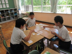 3年生が国語で「へんとつくり」について学習しています。子供たち自身が作成したカルタを使って、いろいろな漢字の学習をしていました。