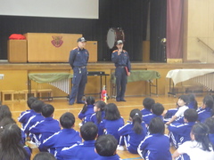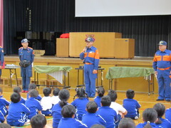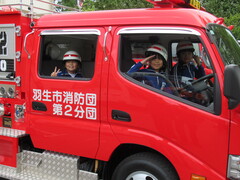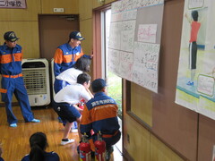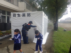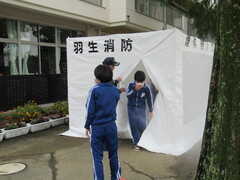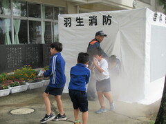 羽生市消防本部、新郷消防団の皆様に来ていただき、消防体験学習を行いました。