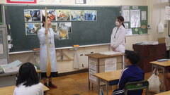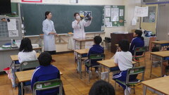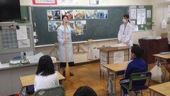 給食センターの調理員さん、栄養士さんが給食センターの様子をお話ししてくださいました。