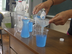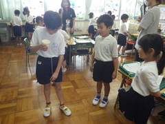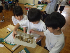 どちらの入れ物がたくさん入るかと、興味津々に学習していました。