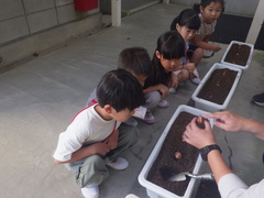 初めて入る小学校の教室に緊張しながらも、内科・歯科・視力・聴力、その他の検査に取り組んでいました。検査終了後には、一人一つずつチュウーリップの球根をプランターに植えました。入学してくることにきれいに咲いていると思います。