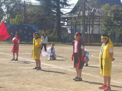 石拾いや、テント張り、万国旗つけ、テーブルや椅子の用意など全校児童で取り組みました。