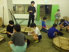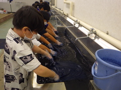初めての藍染め体験に子供たちはドキドキしながら取り組みました。一人一人、違う模様の素敵なハンカチができました。