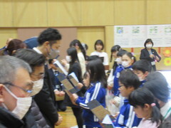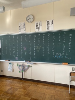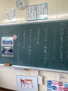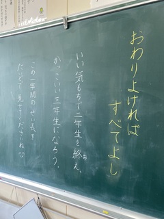 各学級では、担任の先生からのメッセージがどの学級も書かれていました。1年間過ごした教室をお別れをする日です。修了書を担任の先生から渡されました。一人一人の1年間をふり返る貴重な時間となりました。