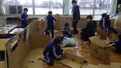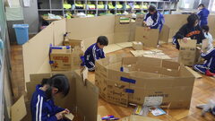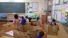 1年生が生活科の授業の一つで「ダンボールハウス」を製作しました。