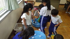生活科の学習の一つとして、「水遊び」を行いました。自分たちで用意した容器からでる水で的当てをするなど、水をつかってたくさんあそびました。