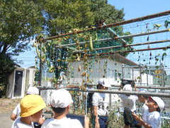 4年生が1学期から育てているヘチマの観察を行いました。植えた時とは比べものにならないくらい成長したヘチマに驚き、特徴など細かいところに注意しながら観察を行いました。