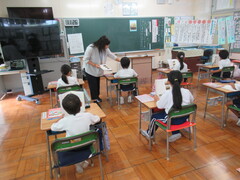 始業式の後は、学級で担任の先生やお友だちと過ごしました。宿題の提出や夏休みの出来事などを発表したり、学校図書館にいったりしました。久しぶりに仲間と会えて、児童の表情はとても明るいものでした。