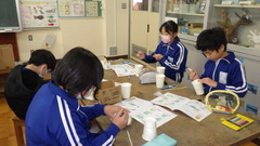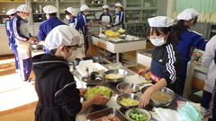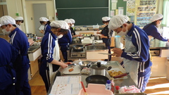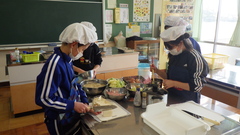 6年生が家庭科の調理実習のまとめとして、自分たちでメニューを決めて調理を行いました。