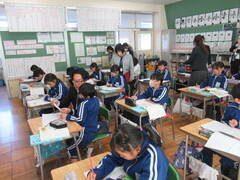 3年生が国語の研究授業を行いました。学習した「アリの行列」を生かして並行読書を行った内容を友達に伝える授業でした。一人一人、真剣に文章作りをしていました。