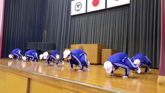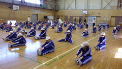 本日は体育館で行いました。運動委員会の児童がステージの上で見本となってくれました。