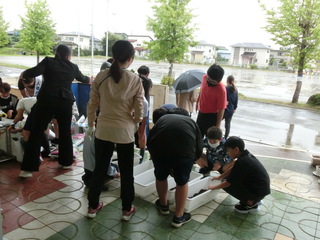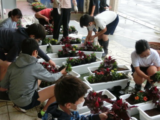 人権推進課や人権擁護委員の方々が来校されて、飼育・環境委員の子供たちと人権の花贈呈式を行いました。「人権の花」(苗)を子供たちが育てることを通して、協力することや感謝することの大切さを学ぶということです。小雨が降っていたのですが、たくさんいただいた花の苗をプランターに植えました。大切に育てていきます。