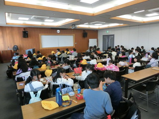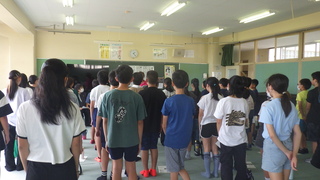 厳しい残暑の日でしたので、校舎の中でふれあいタイムを行いました。縦割り班の6年生が中心となって、フルーツバスケットやへびジャンケンなどの室内レクを楽しく行いました。