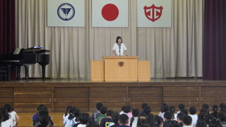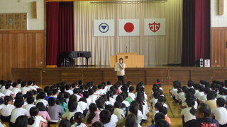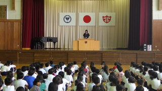 今回は、校長講話と今月の生活目標についてのお話です。校長からは、6年生が修学旅行で様々な人の話をしっかり聞いていたことや須影小学校の伝統、10月26日に行われる運動会についての話がありました。次に今月の生活目標の話がありました。10月の生活目標は「時間を守って行動しましょう」です。担当の先生からチャイムが鳴って行動するのではなく、チャイムと同時に運動会の練習や授業が始められるように意識をしましょうなどのお話がありました。