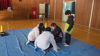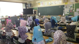 竜巻の危険から自ら身を守るために、避難訓練をしました。9月や10月は、竜巻の発生確認が多くなるということがいわれているからです。竜巻もその他の災害もいつ、どこで起きるかわかりません。災害が発生したときの安全に避難する基本的な行動についてみんなで確認しました。