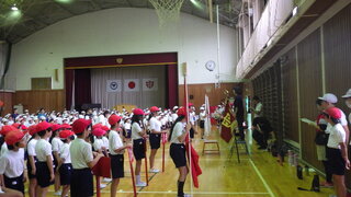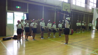 雨が降りそうでしたので、体育館で運動会の開会式・閉会式の練習をしました。いろいろな係を担当している6年生が先頭に立って進めていました。