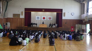 今日の集会は校長の話と生活目標の話でした。校長から「丁寧な言葉を使おう」「ふわふわ言葉を広げよう」「順序を考えて話そう」という話がありました。その後、担当から5月の生活目標「時間を守って行動しましょう」の話がありました。